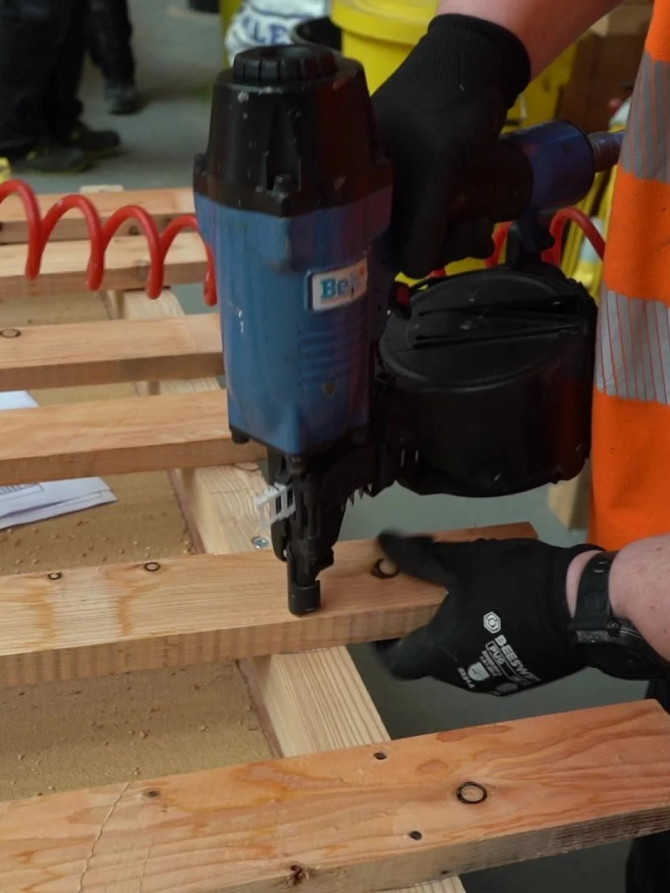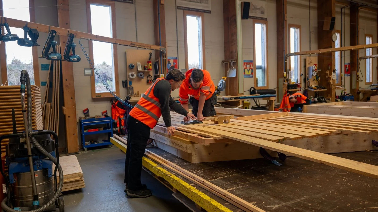 The manufacturing process centres on ‘lean’ workstations featuring pneumatic tooling connected to overhead booms, creating ergonomic workspaces whilst enabling repeatable accuracy and quality assured products. A three-tonne gantry crane provides precision handling of substantial timber panels during critical transitions from factory to site.